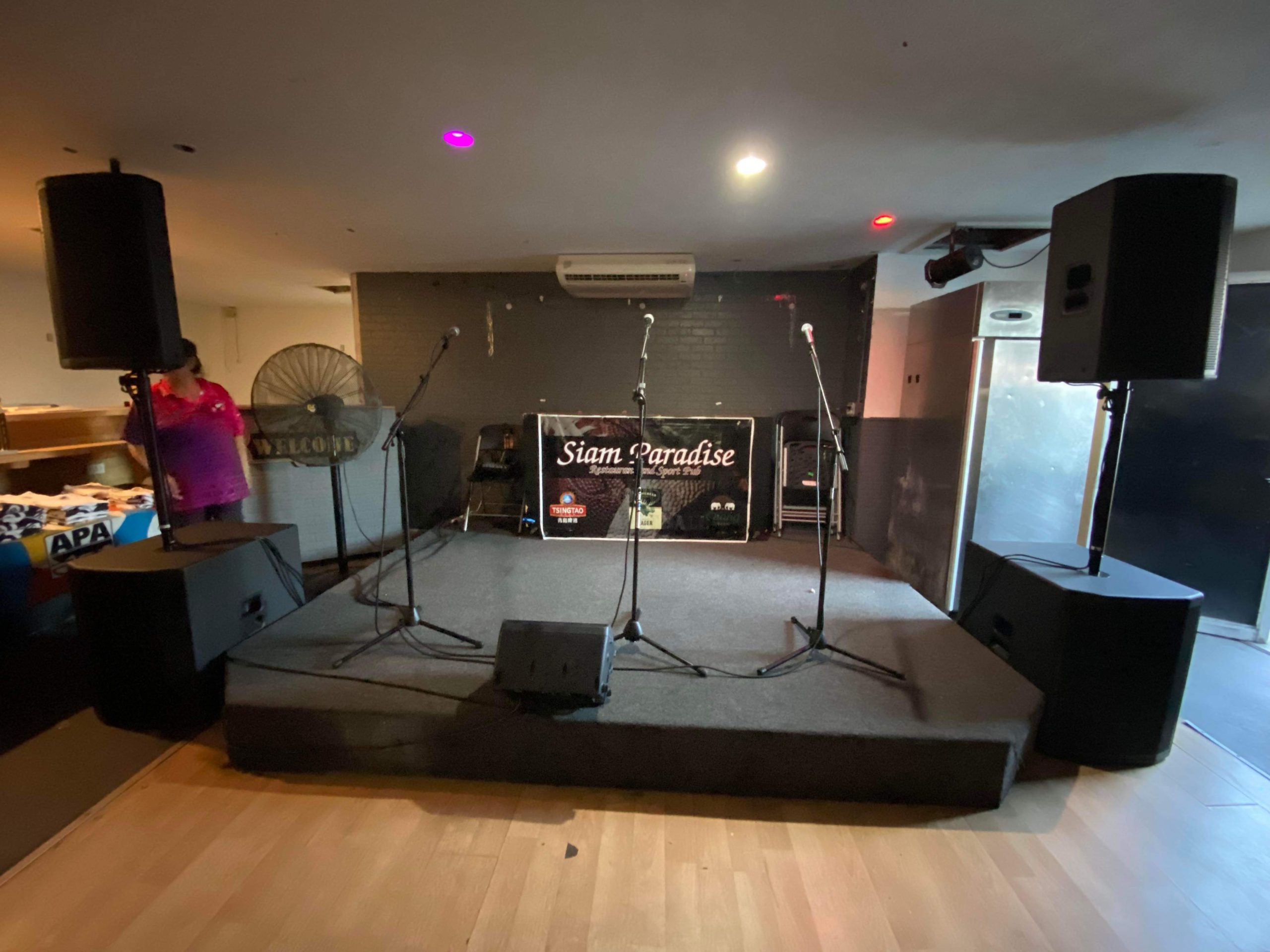 2- main 15’ speakers powered 2- floor monitors 8’ powered 2- subwoofers 18’ powered 3- microphones 2- mic stands 1- mixing board 8channels mixer.
